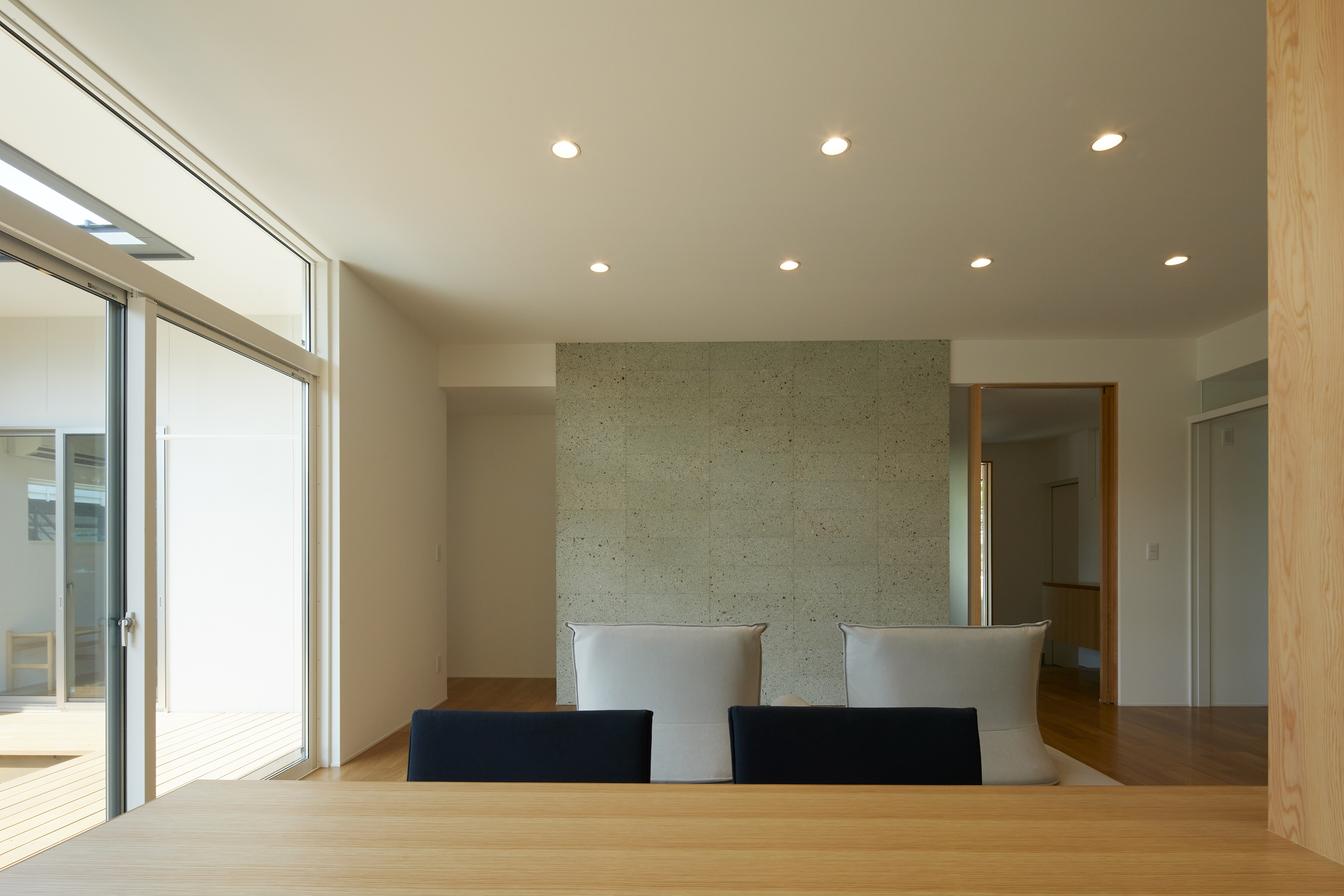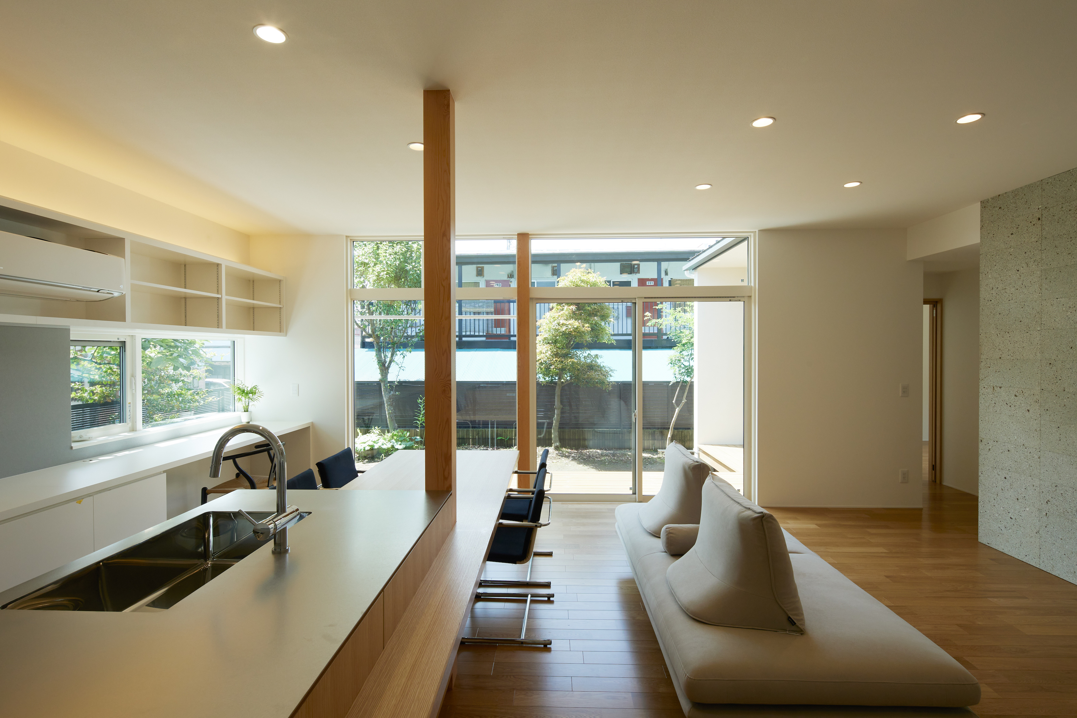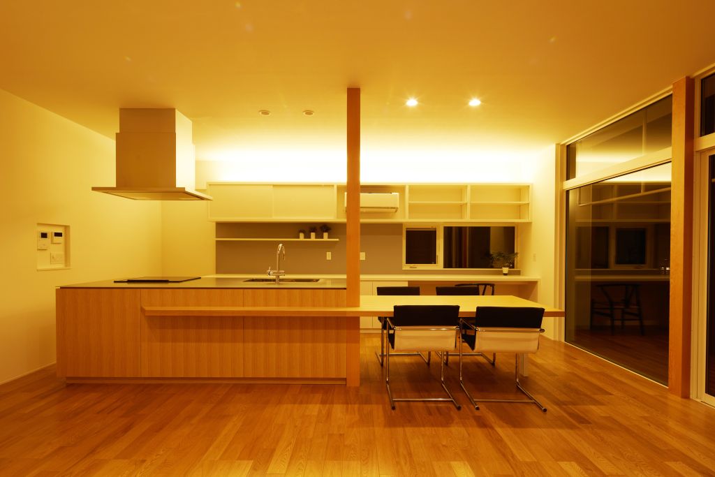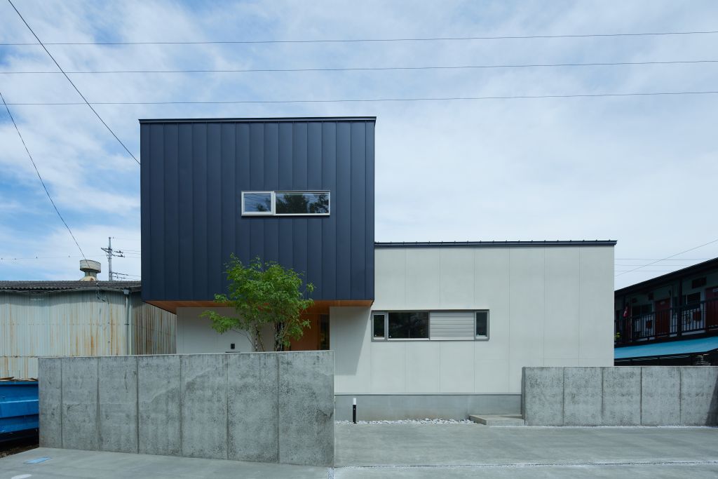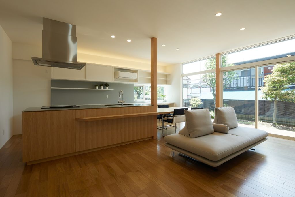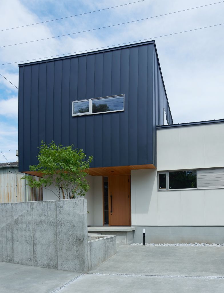 | 閑静な住宅街に建つ一部2階建とした二世帯住宅の計画です。片持ちで浮遊感のある玄関ポーチが特徴的な箱型モダンの外観です。東南に向けて囲われた庭を設け、室内には光が差し込み、明るく開放的なLDKとしました。造作キッチン+ダイニングテーブル・大谷石張の壁等、インテリアにもこだわりました。 |