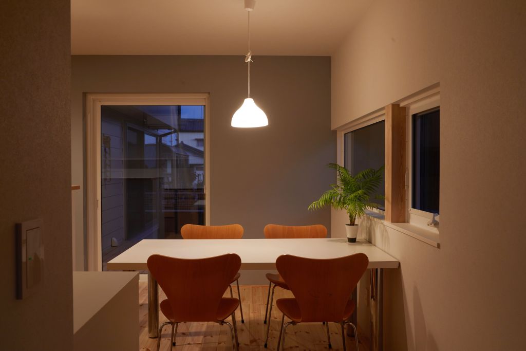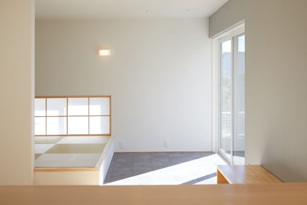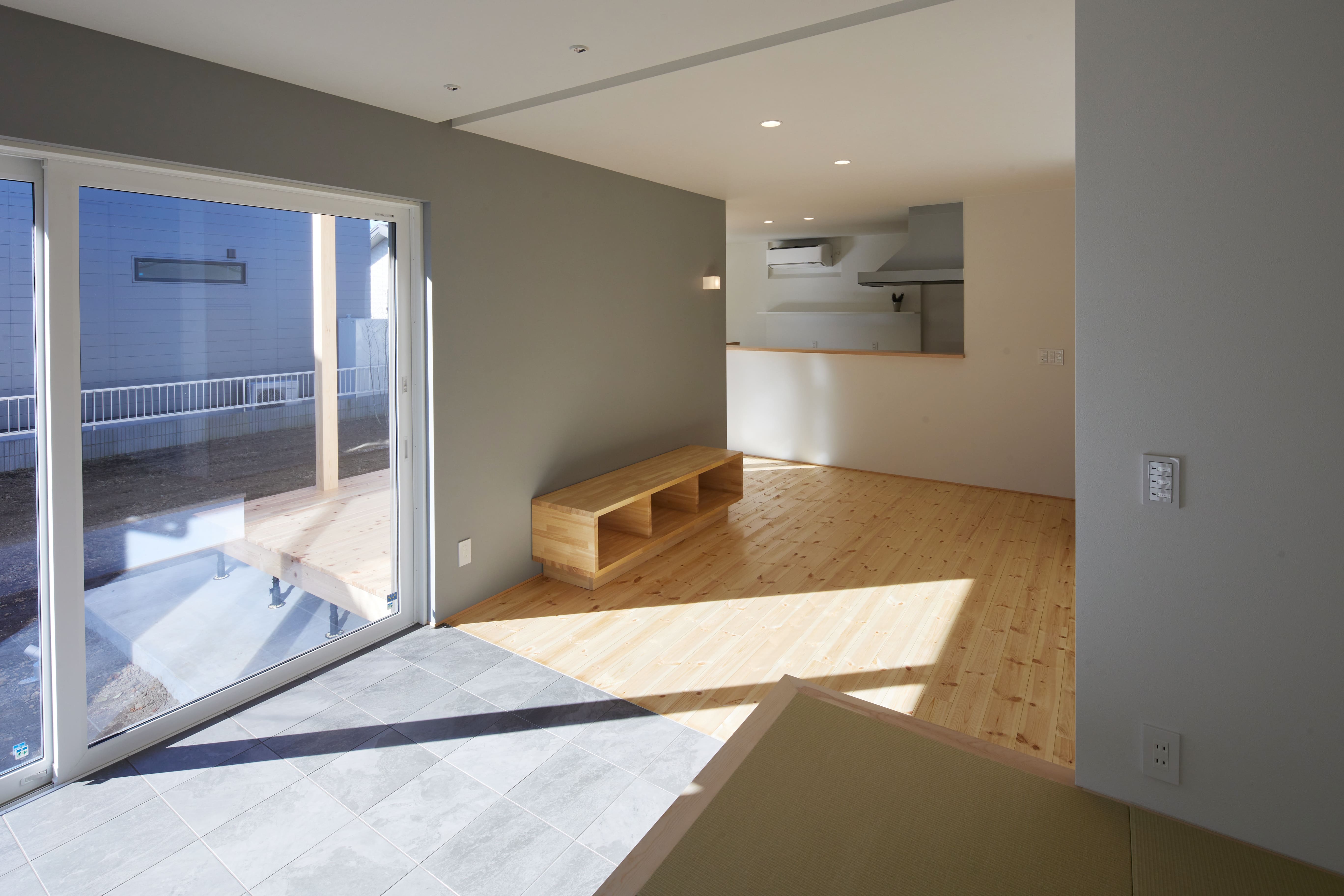市街地に建つL字型切妻屋根の住まい 庭を取り込むL型LDK 北側道路に面しているので玄関やアプローチ、駐車スペースを北側に設け、南側はゆとりのある庭を確保して、隣接している住宅を気にすることなくプライバシーのある落ち着いた住空間としています。 Data 所在地 足利市山川町 用途・構造 専用住宅 木造2階建 敷地面積 272.93㎡ (82.5坪) 床面積 1階:71.70㎡ (21.7坪) 2階:39.33㎡ (11.9坪) 延床面積:111.03㎡ (33.6坪)