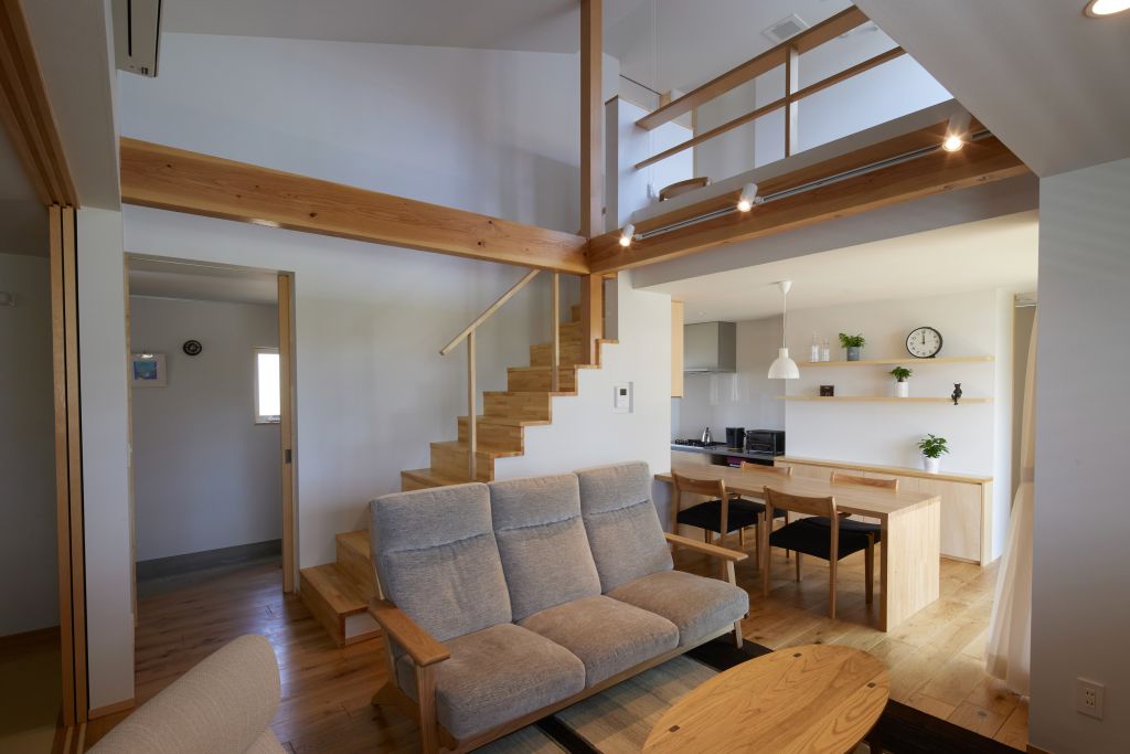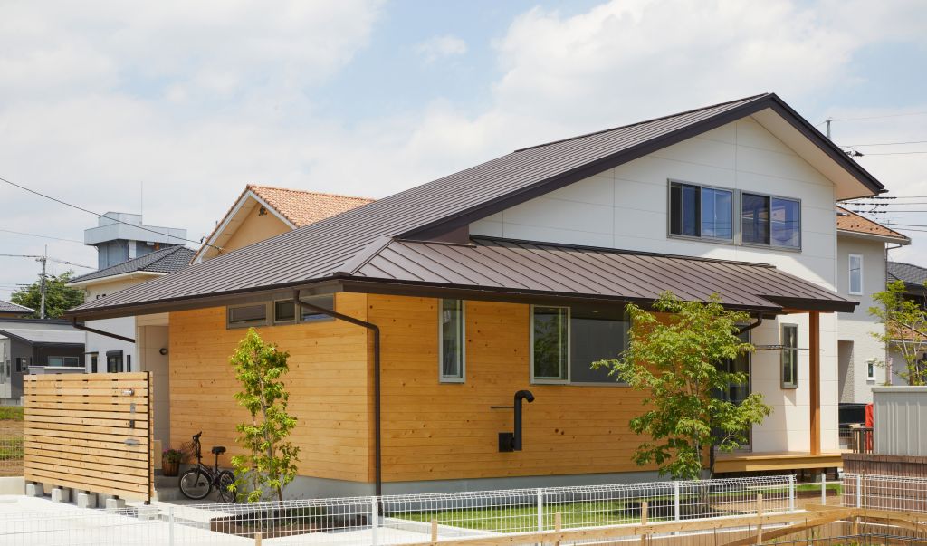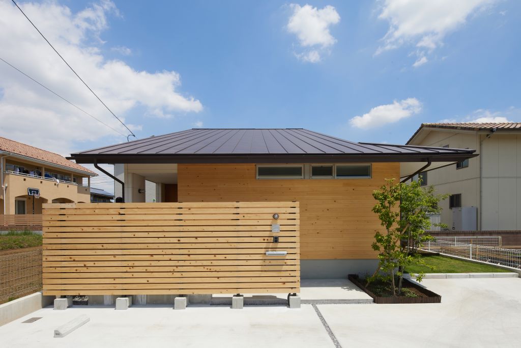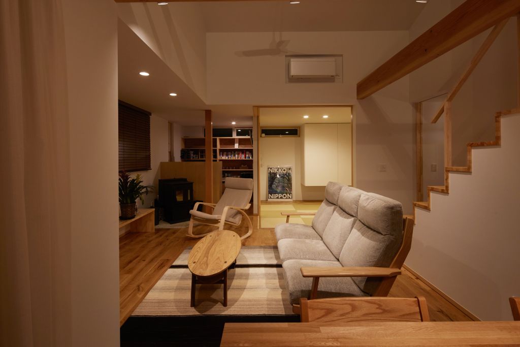 夫婦と子供が暮らすペレットストーブのある招き屋根の住まいが完成しました。床面積をコンパクトに抑えながら吹き抜けや連続性のある空間の住まいとしました。外観は伸びやかな招き屋根と通りに面したファサードに桧無垢材を使ったナチュラルテイストなデザインになります。内部はLDKを中心にリビング階段やテレワークに対応した書斎、ダイニング一体型の造作キッチン、ペレットストーブ等、こだわりの詰まった空間としました。 |