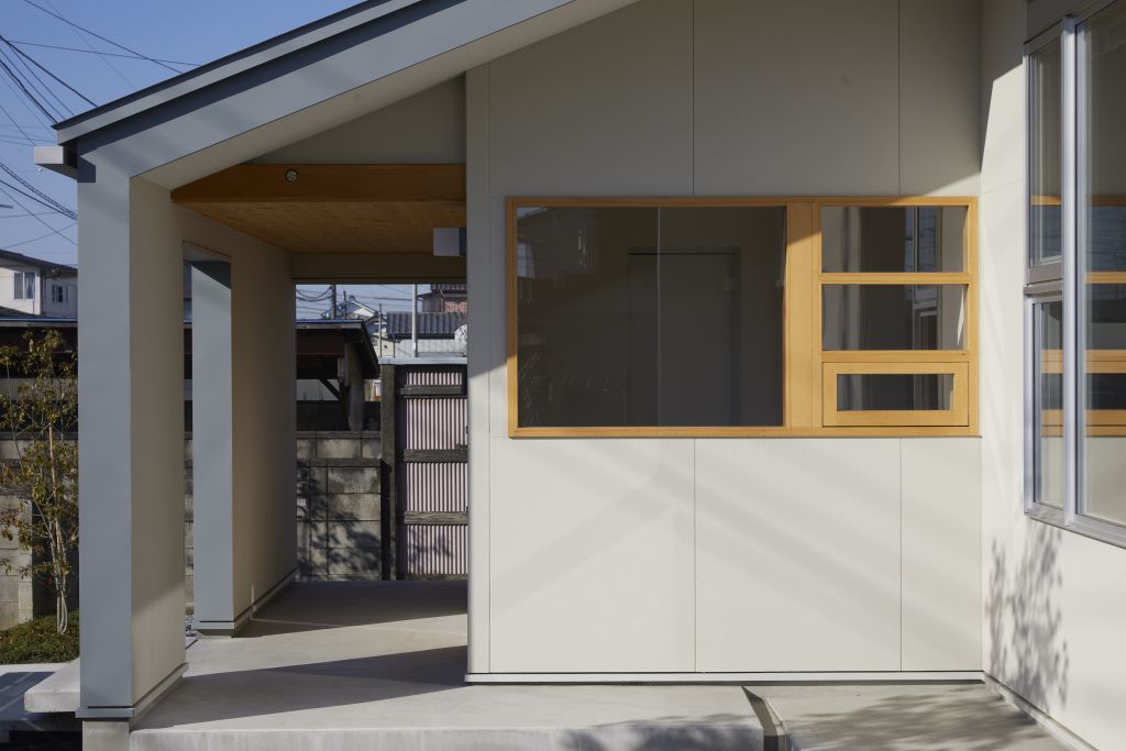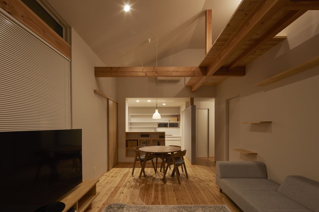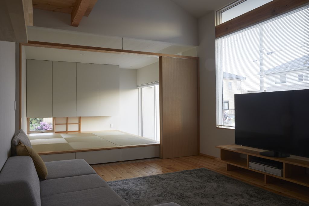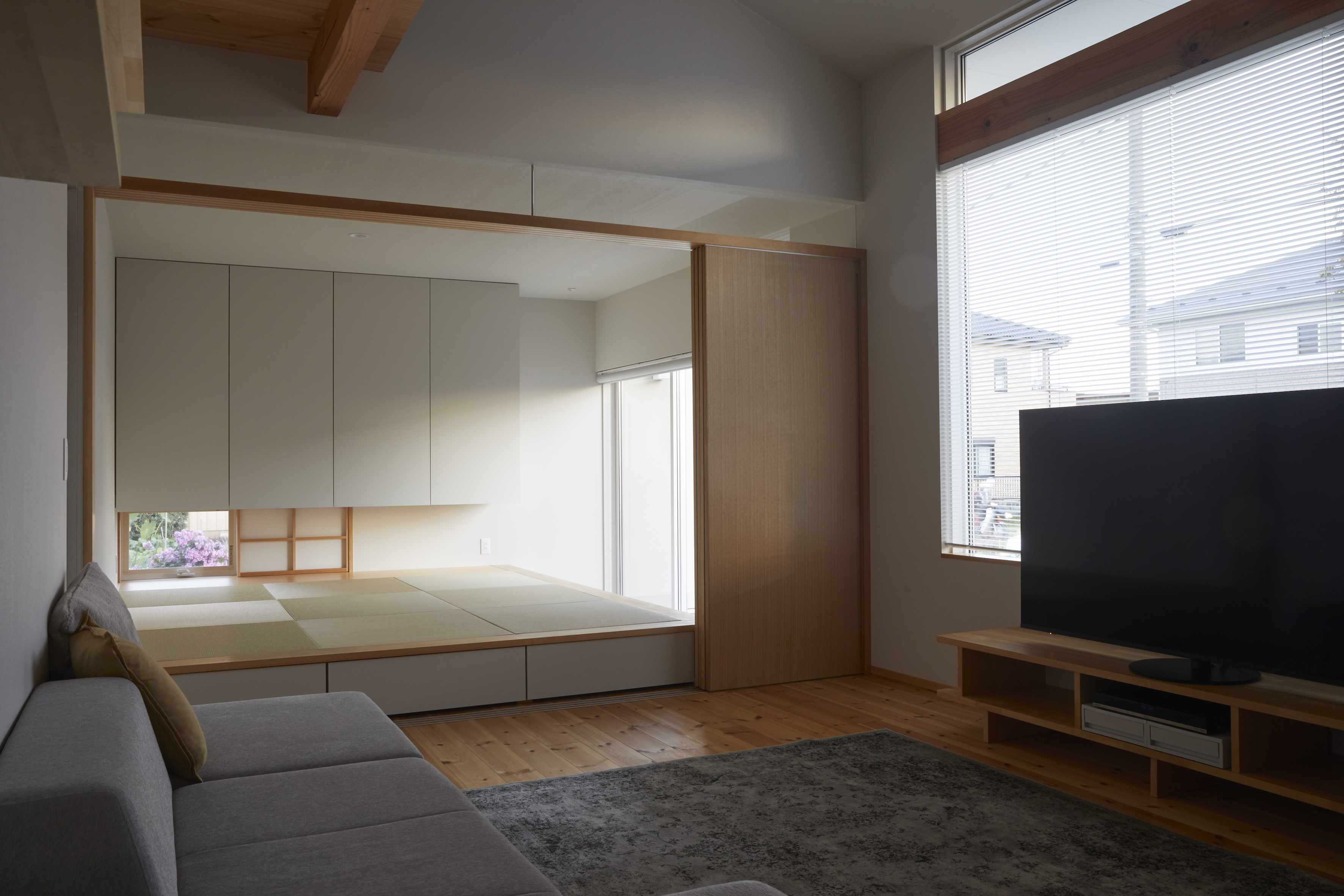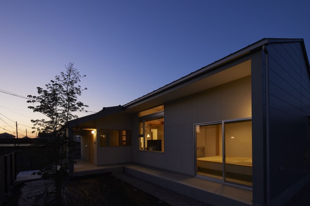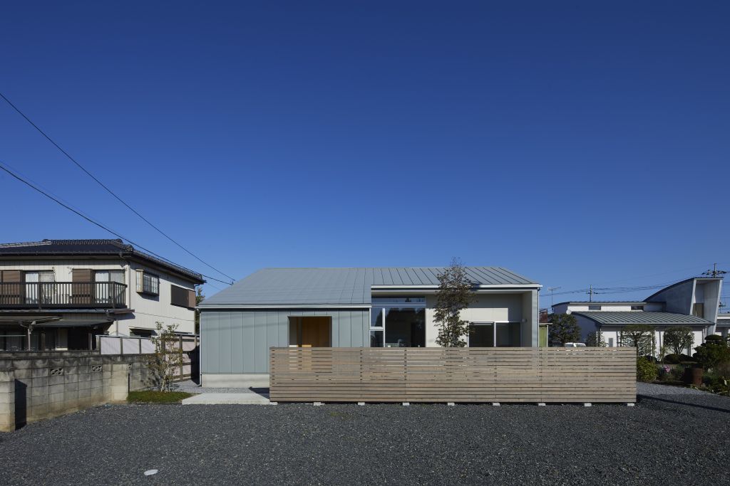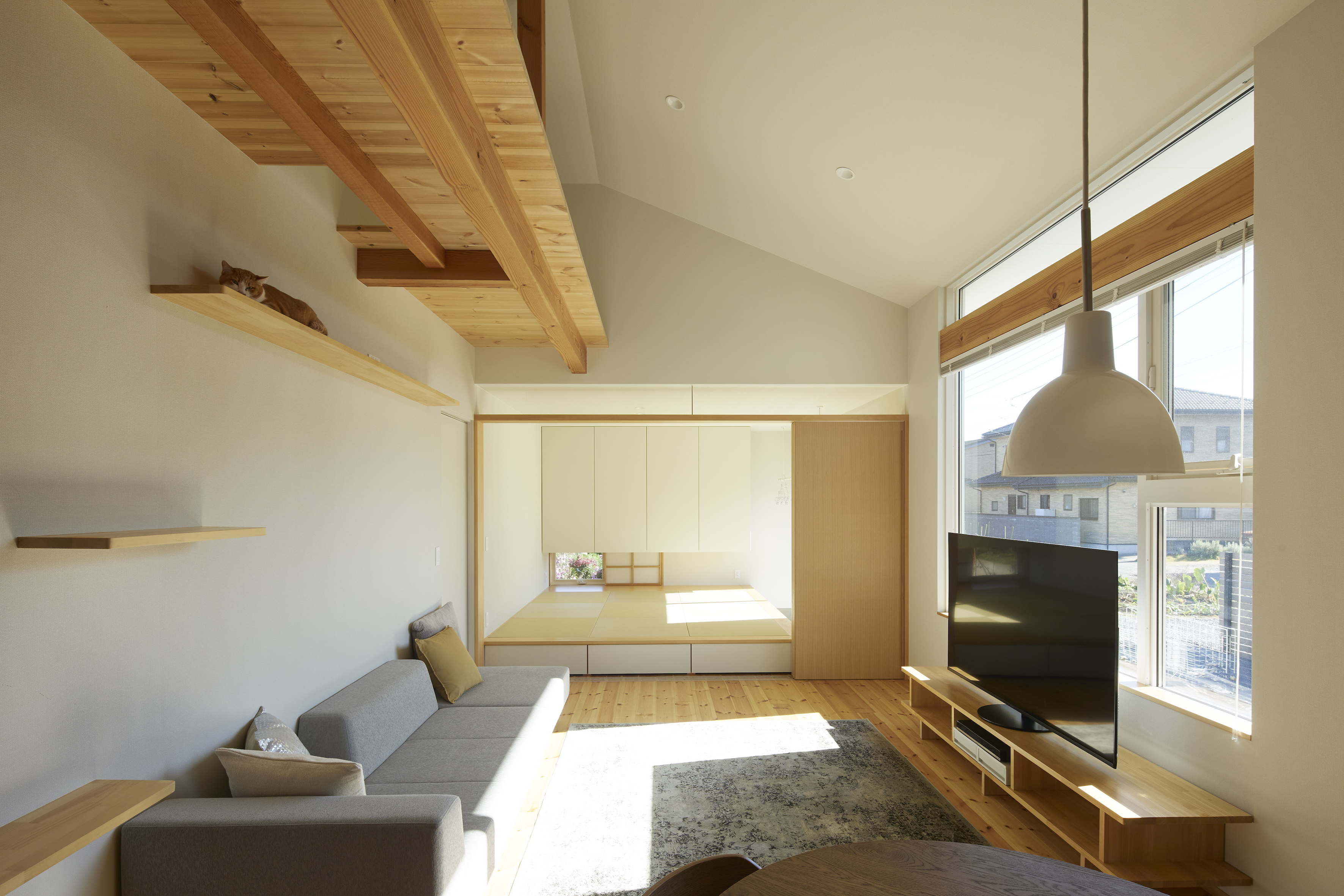 シンプルモダンのすっきりとした外観と、キャットウォークのある開放的なLDKで家族と猫がのびのびとくつろぐ穏やかな空間の平屋の住まいです。LDKと連続した小上がりの和室はより広がりを感じます。土間を設けることで室内物干し場や猫のくつろぎスペース等快適でフレキシブルな工夫を設けています。ブルーグレーのガルバリウム外壁に米ヒバの木製建具が外観デザインのアクセントになっています。 |