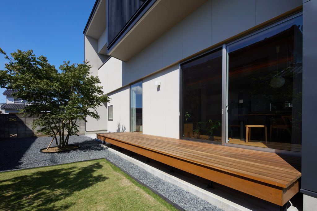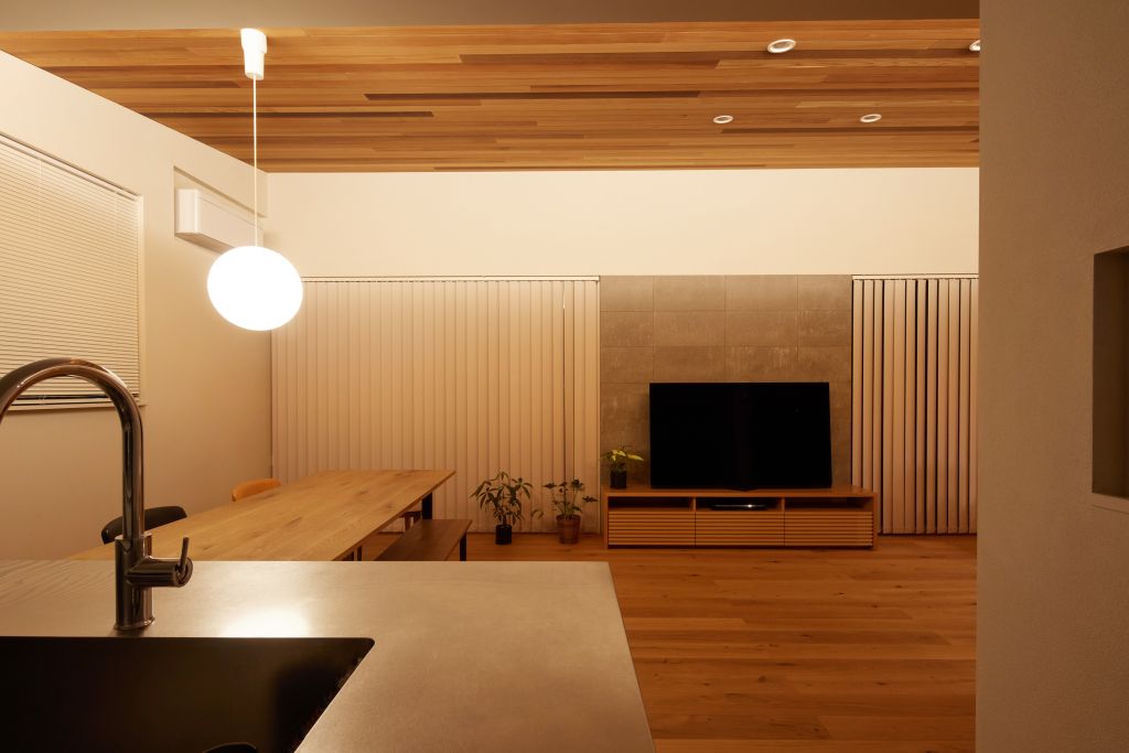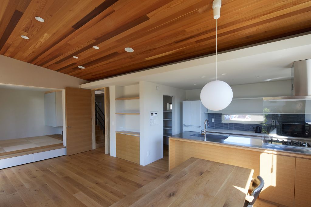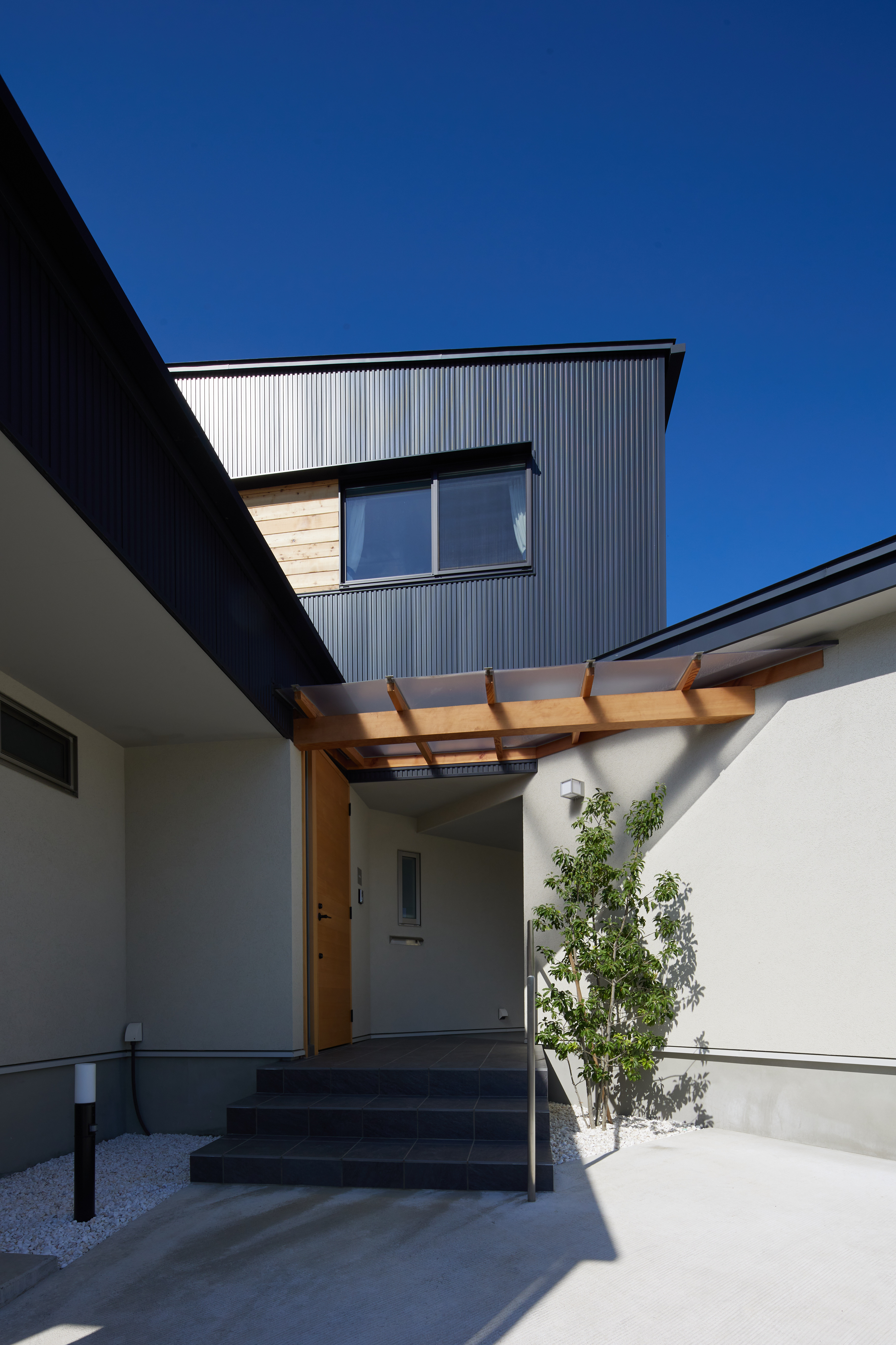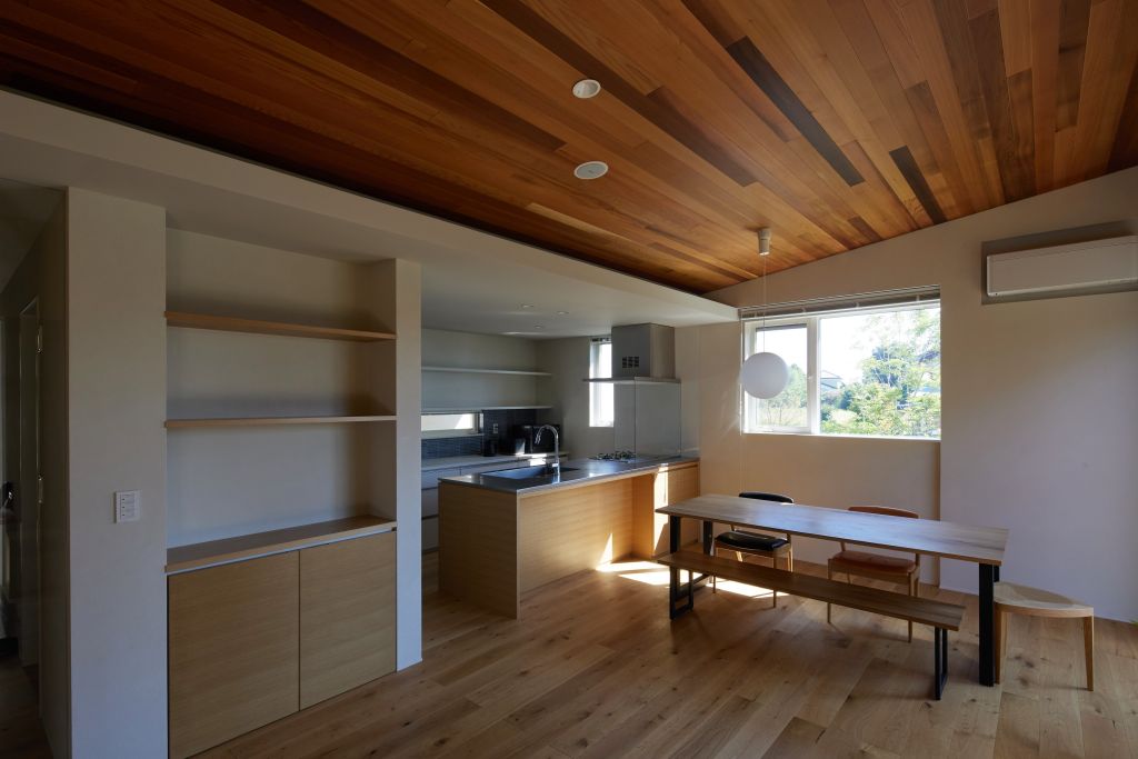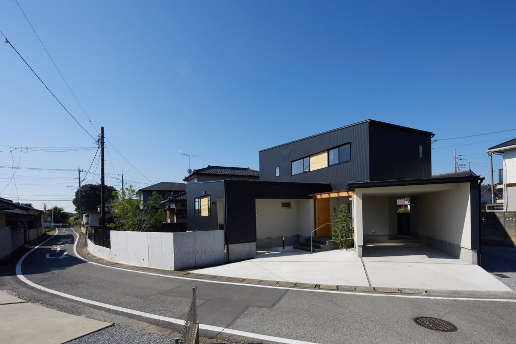 館林市尾曳町 つつじが岡公園近くの自然豊かな敷地に、夫婦と子供が暮らす扇型敷地に建つガレージのある住まいが完成しました。外観は扇型の敷地を有効利用する為、建物本体に45度の角度をつけたガレージが一体となるモダンな箱型デザインとしました。モノトーンの色合いに無垢板外壁がアクセントになっています。内部は板張勾配天井のリビング・ダイニングに造作キッチン、階段ホールとつながるワークスペース等丁寧に空間を造り込みました。こだわりの詰まった居心地が良い空間です。 |